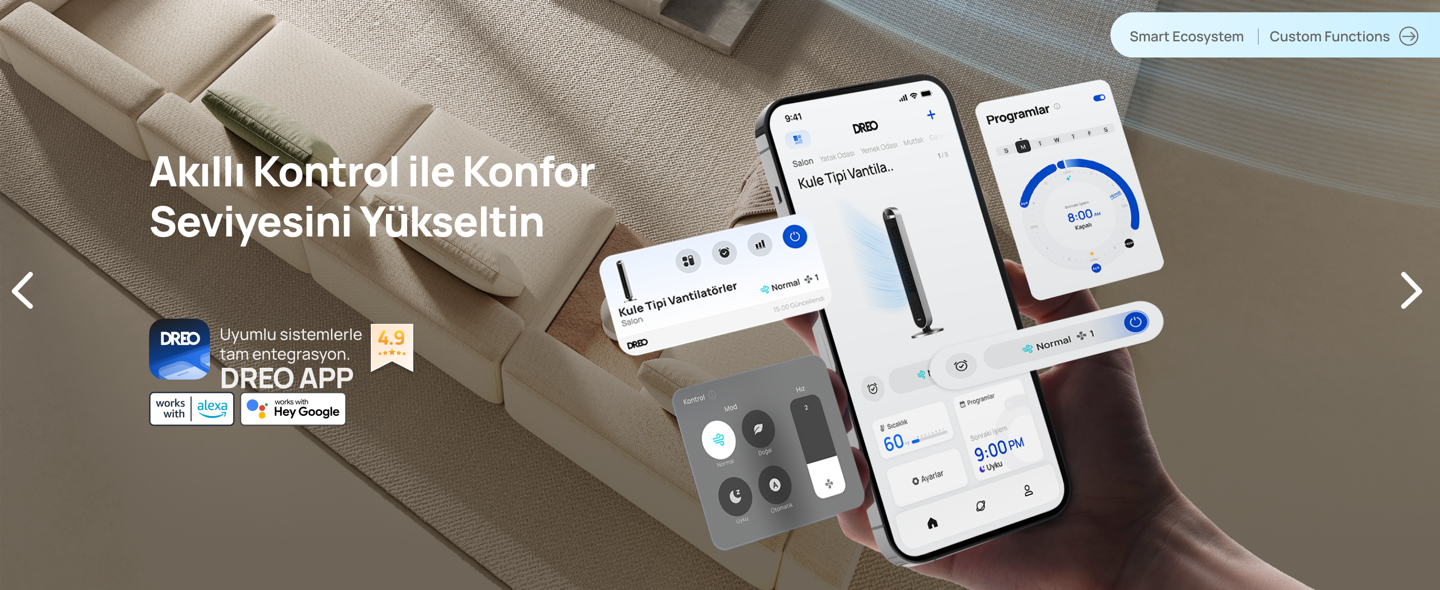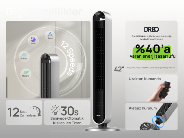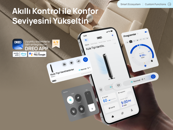 - DREO uygulaması, Amazon Alexa ve Google Home ile uyumlu